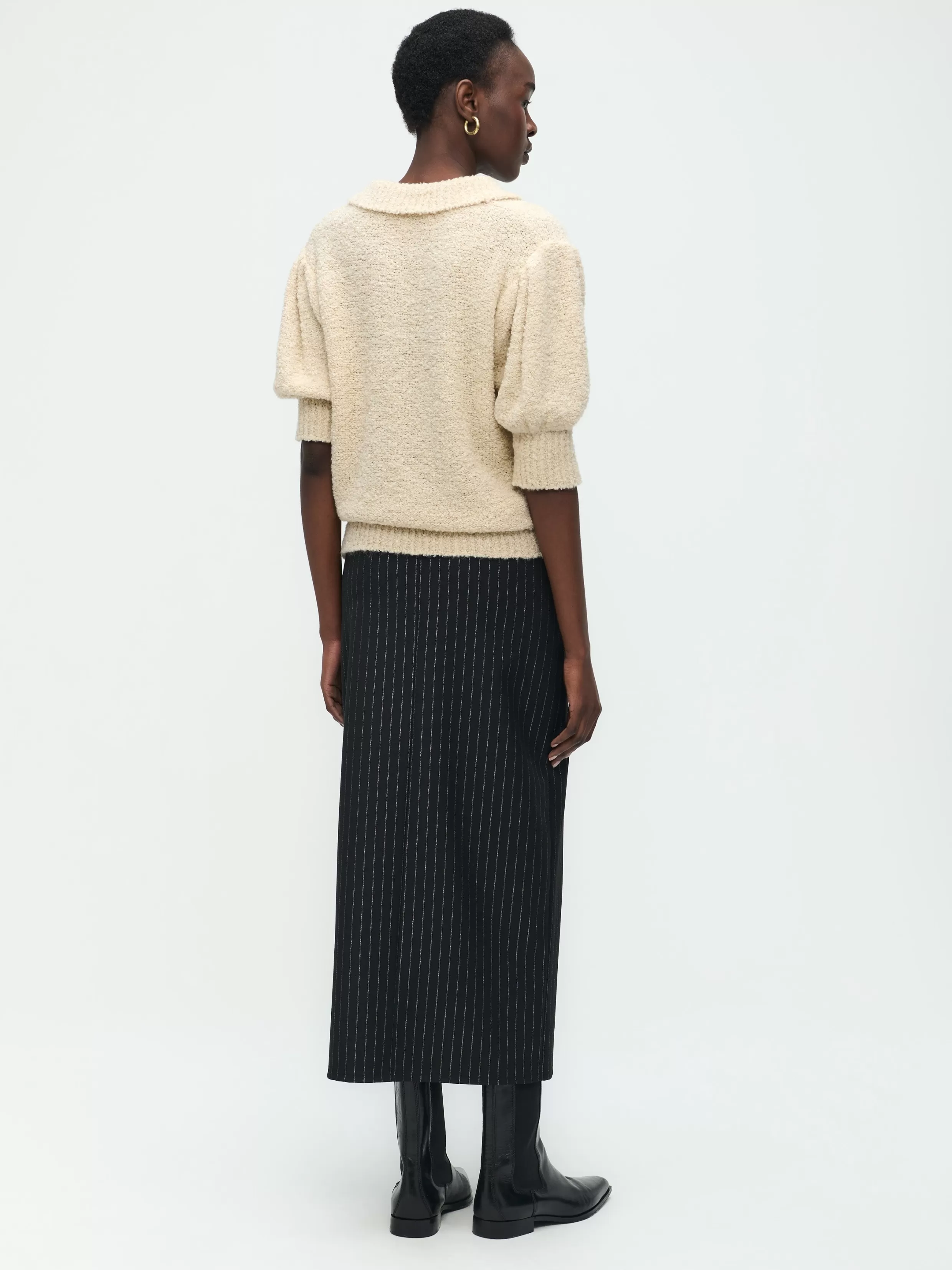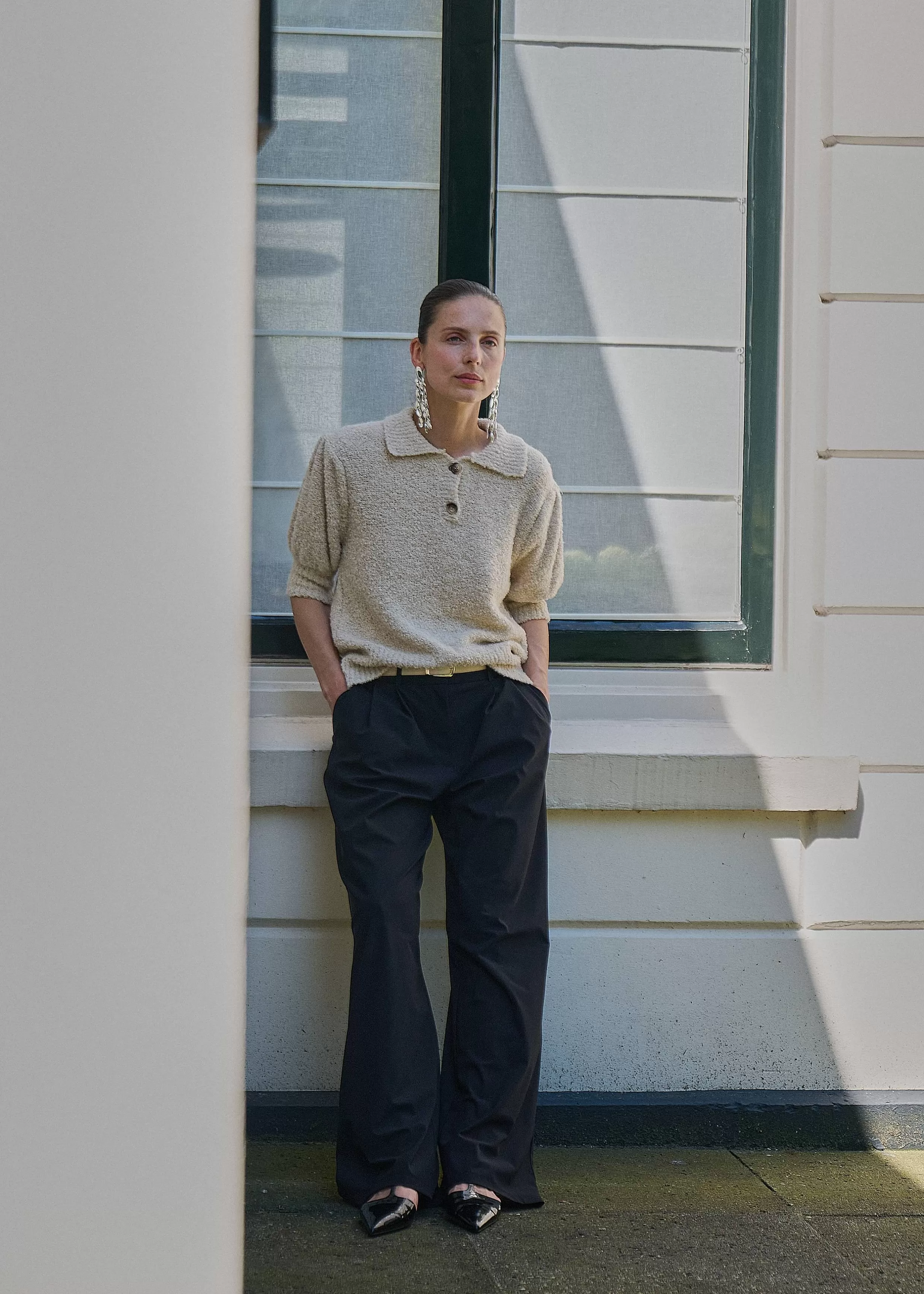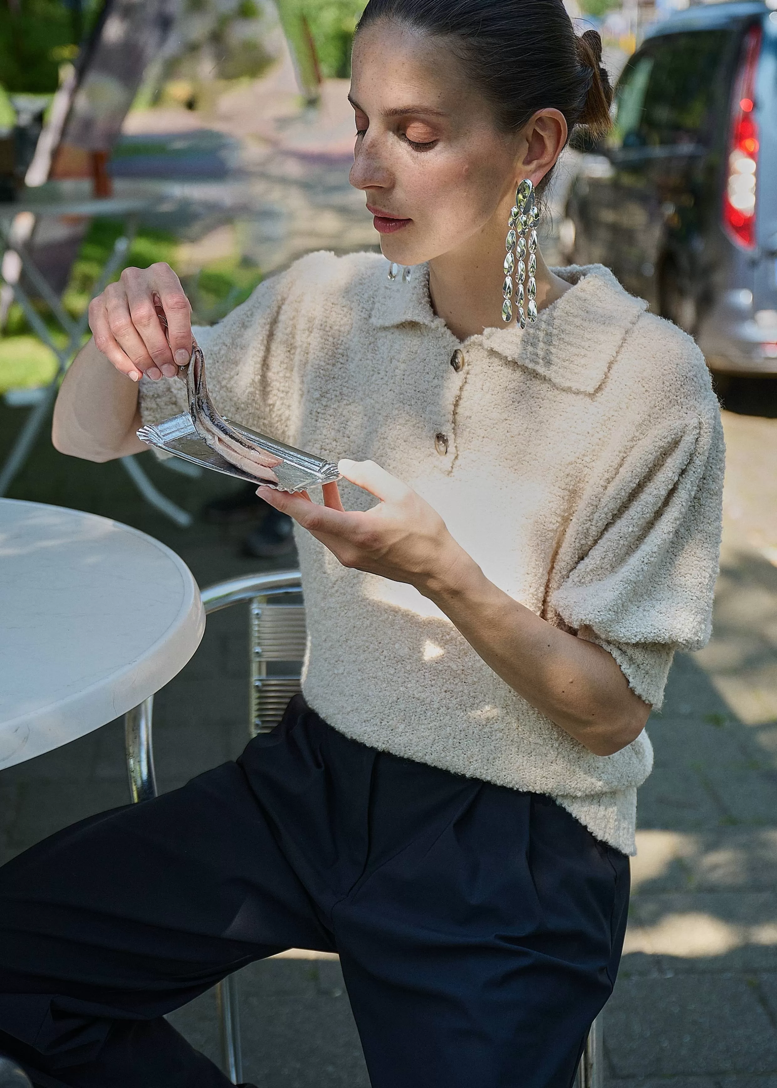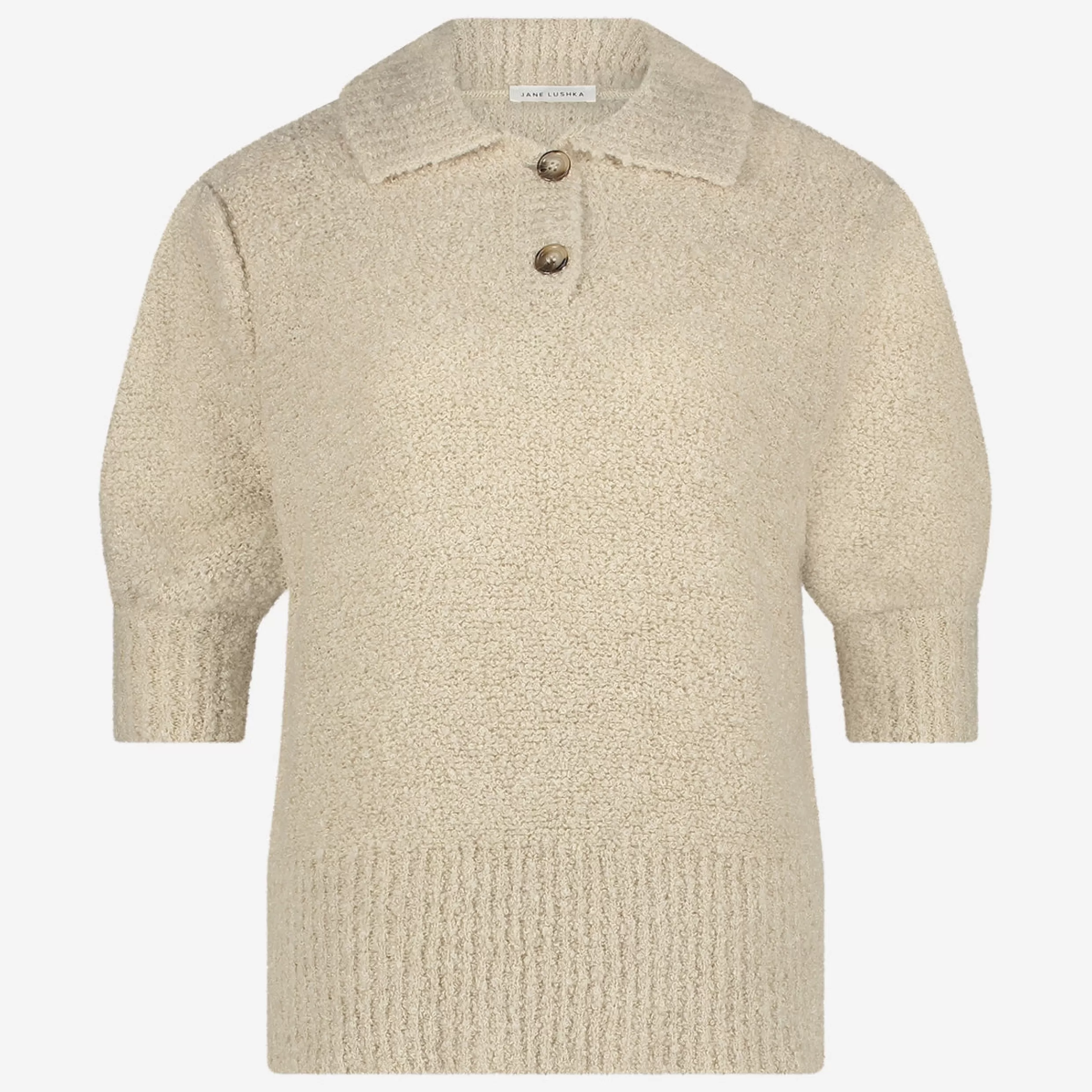 Bliss Boucle Pullover: Verhoog je garderobe met de Bliss Boucle Pullover, met korte mouwen en een klassieke kraag. Deze pullover is gemaakt van boucle stof met textuur en biedt een verfijnde en tijdloze look.