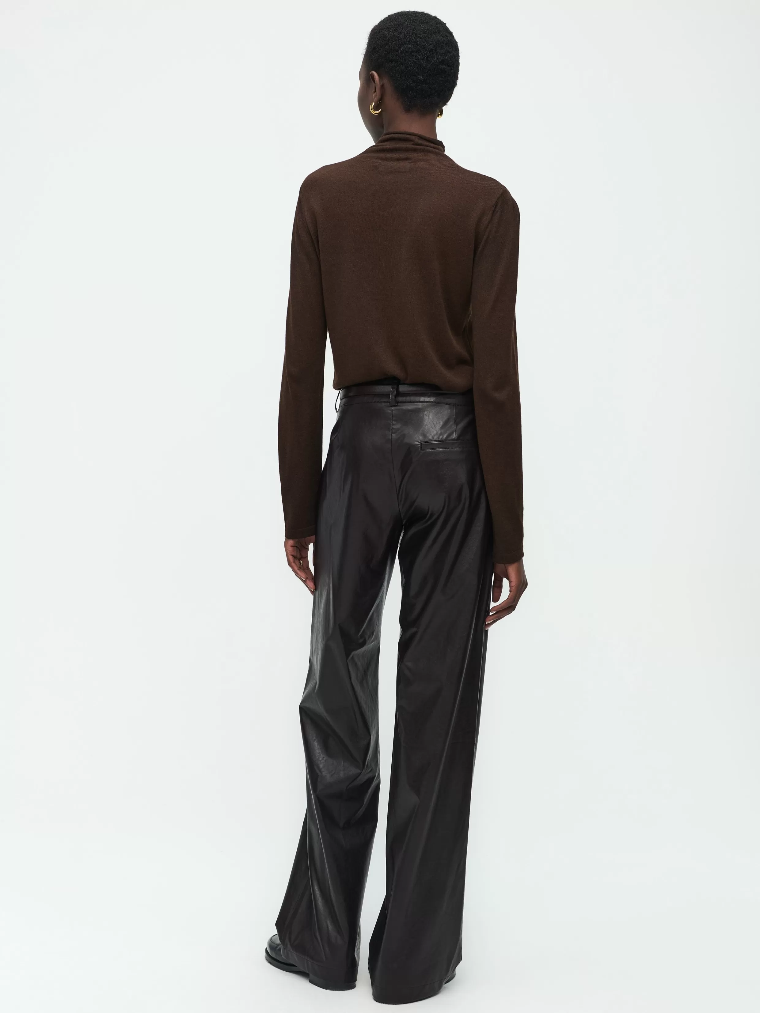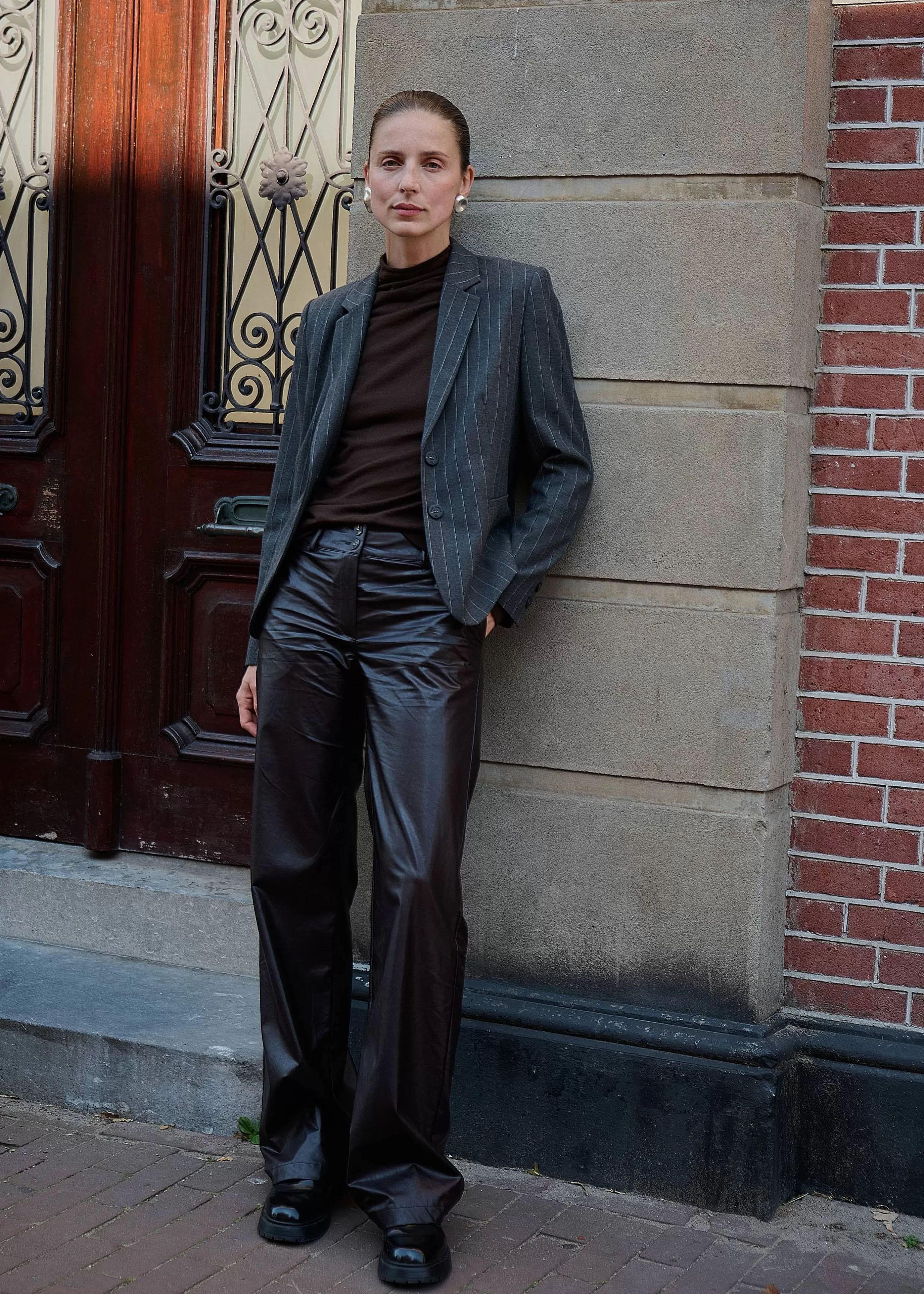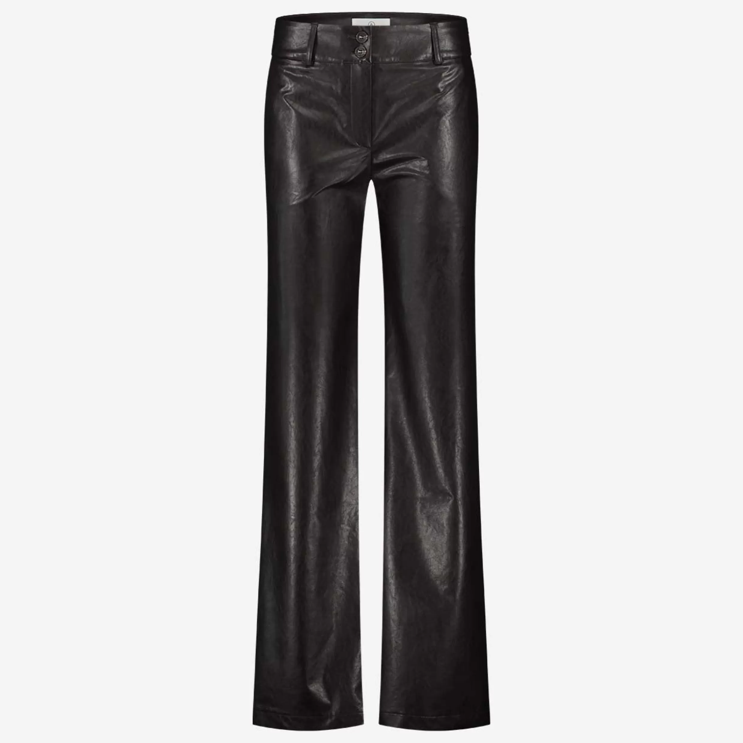 Linda Broek: Verhoog je stijl met deze luxe viscose leren broek met rechte, wijde pijpen. De broek heeft schuine zakken aan de voorkant en een steekzak aan de achterkant en biedt zowel elegantie als functionaliteit voor een geraffineerde look.
