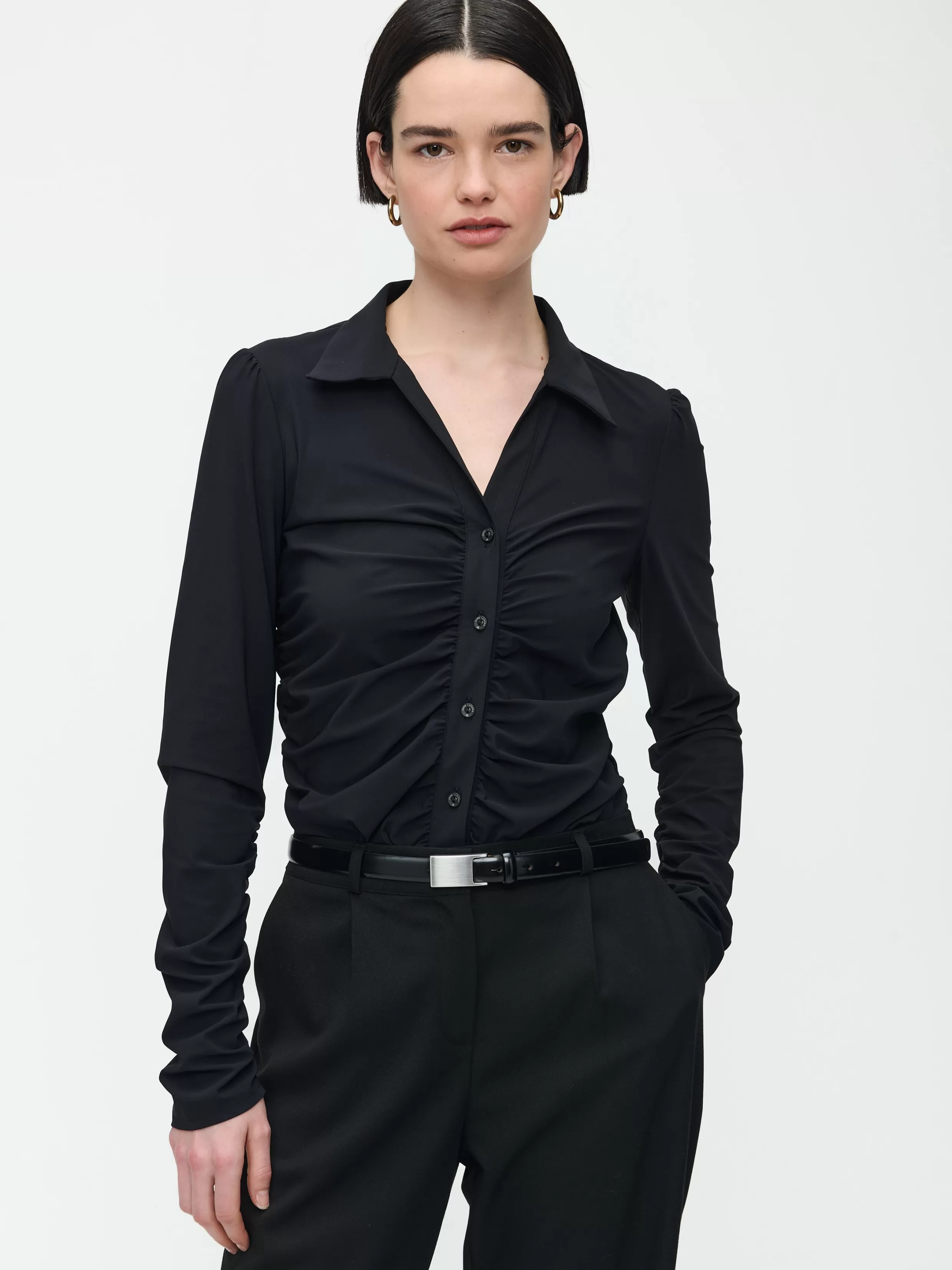 Verhoog je garderobe met de Luisa Blouse, zorgvuldig vervaardigd uit hightech jersey. Deze stof zorgt voor een soepele en comfortabele pasvorm, die zich prachtig aanpast aan de vorm van je lichaam met behoud van een elegante drapering.